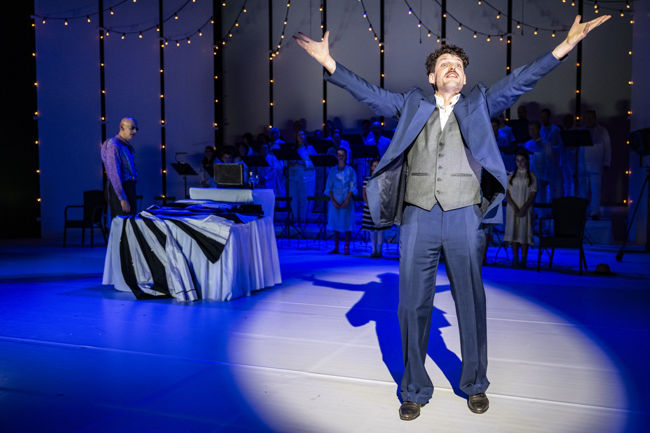 Dabei übernimmt zum ersten Mal ein Chor jenen Part, der üblicherweise von Instrumenten gespielt wird. Als herausragendes „Orchester der menschlichen Stimmen“ sind 28 Sänger*innen des SWR Vokalensembles aus Stuttgart zu erleben. Zur „musikalischen Masse“ im Bühnengeschehen gehören darüber hinaus 12 Kinder des wunderbaren Salzburger Festspiele und Theater Kinderchors. Als MENSCHEN und MÄCHTIGE begegnen ihnen Hermine Schrattenecker (Giulietta), Joshua Miro Ebsen (Mario), Michael Günther (Cipolla) und Maarten Güppertz (Luigi).